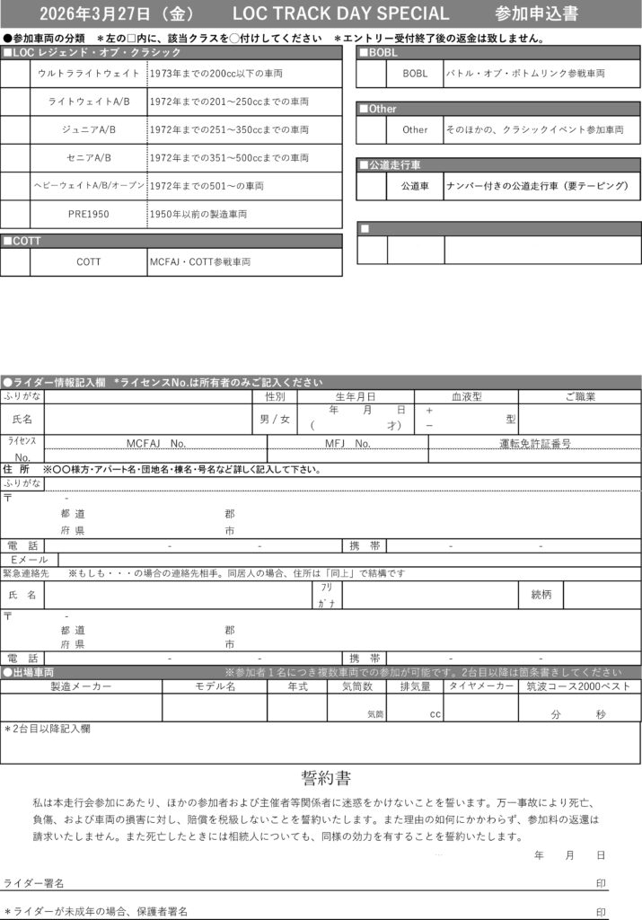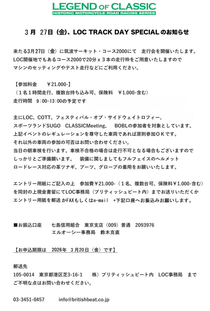 LOC TRACK DAY SPECIAL を開催いたします。(午前中のみの走行会です)
