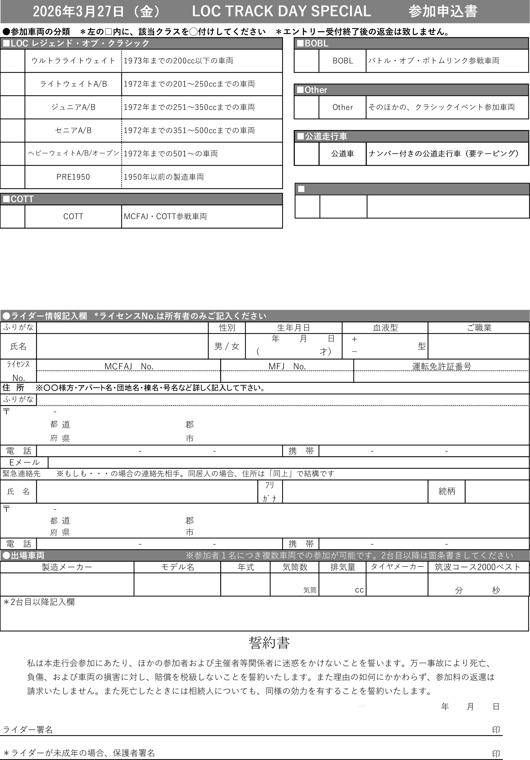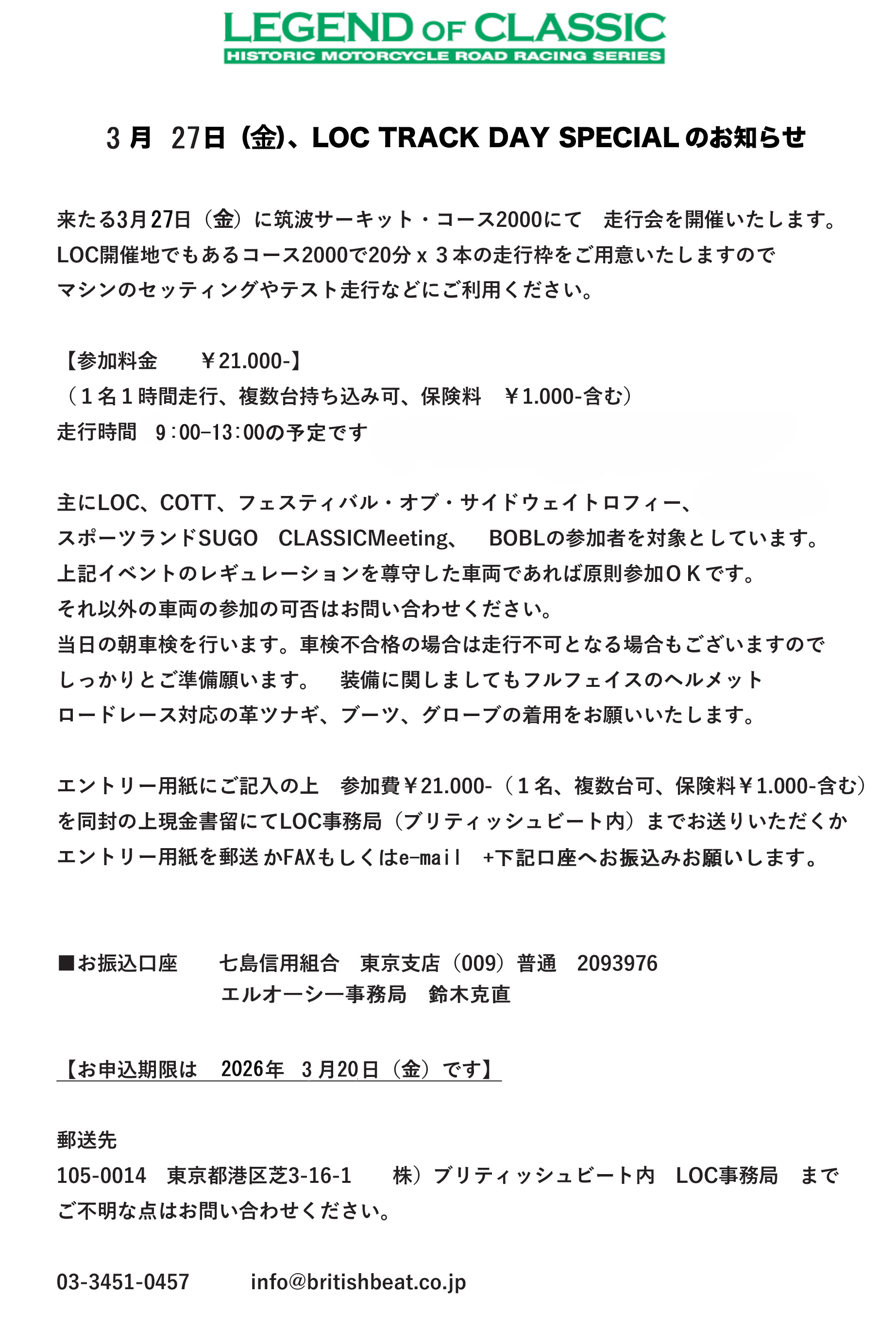LOC TRACK DAY SPECIAL を開催いたします。(午前中のみの走行会です)